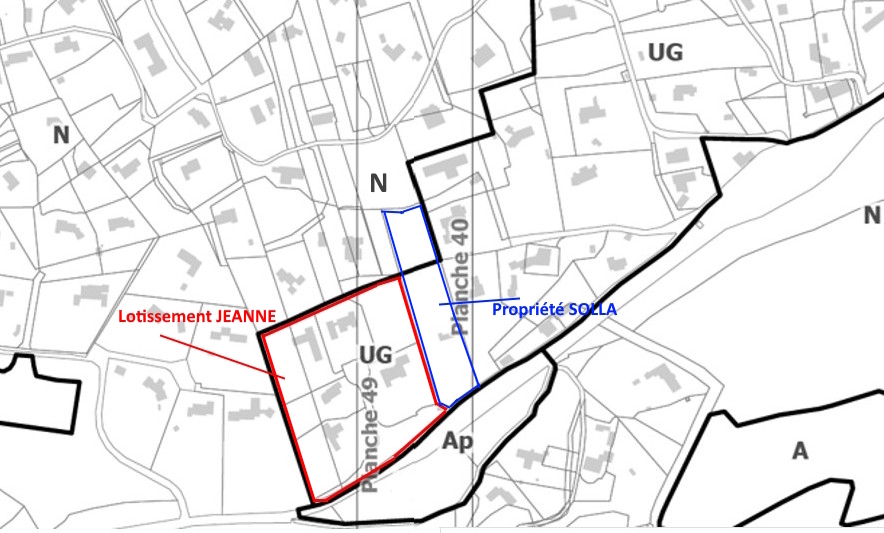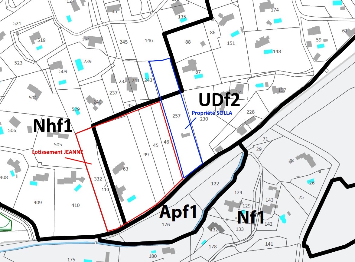 J’ai interrogé M. JEANNE par mail du 23 novembre 2025 avec copie à Mme PEYRONNET (pour lire : le mail 23 novembre 2025) sur la différence de traitement du terrain limitrophe de 5 727m² appartenant à M. SOLLA classé au PLU pour 4 017 m² en zone constructible (UDf2) et 1 710 m² en zone inconstructible (Nhf1) . En effet, celui-ci reste classé à l’identique au PLUi : 4 017 m² en UG/constructibles et 1710 m² en N/inconstructibles.